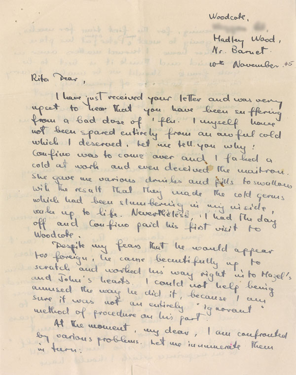 I have just received your letter and was very upset to hear that you have been suffering from a bad dose of flu. I myself have not been spared entirely from an awful cold which I deserved. Let me tell you why: