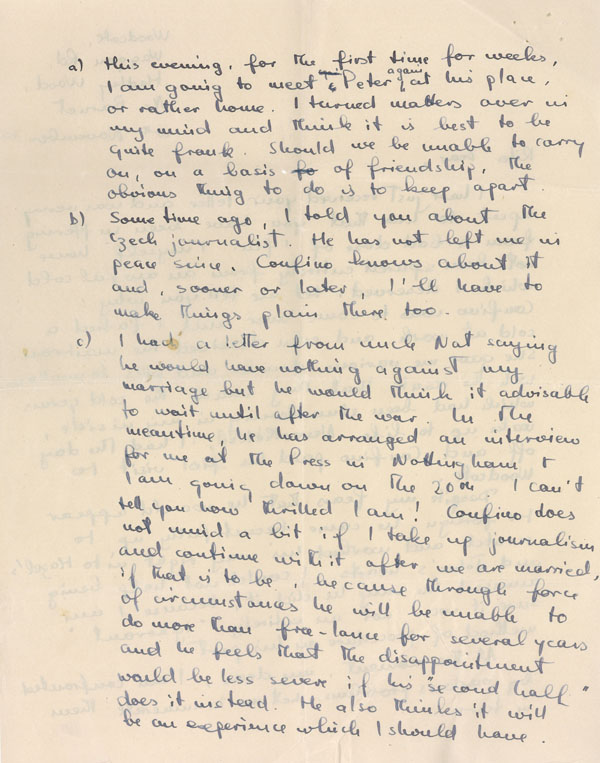 - I had a letter from uncle Nat saying he would have nothing against my marriage but he would think it advisable to wait until after the war. In the meantime, he has arranged an interview for me at the Press in Nottingham and I am going down on the 20th. I can’t tell you how thrilled I am! Confino does not mind a bit if I take up journalism and continue with it after we are married, if that is to be, because through force of circumstances he will be unable to do more than free-lance for several years and he feels that the disappointment would be less severe if his “second half” does it instead. He also thinks it will be an experience which I should have.