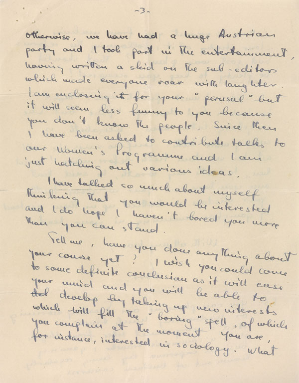 Otherwise, we have had a huge Austrian party and I took part in the entertainment, having written a skid on the sub-editors which made everyone roar with laughter. I am enclosing it for your “perusal” but it will seem less funny to you because you don’t know the people. Since then I have been asked to contribute talks to our Women’s Programme and I am just hatching out various ideas.