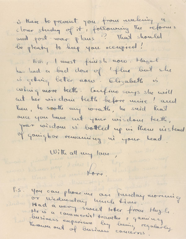 P.S. You can phone me on Tuesday morning or Wednesday lunch time. Had a very sweet letter from Hugh. He is a commercial traveller and gaining business experience by being regularly thrown out of business concerns.