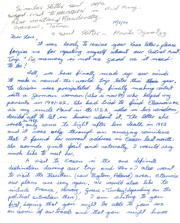 A visit to Essen is the one definite destination during our trip and Lex and I also want to visit the Beuthen (now Bytom, Poland) area. Otherwise our plans are very open. We would also like to include France, Norway, Greece and Turkey (depending on the political situation there). I am writing to you first, hoping that you might be able to join us on some of our travels and that you might have some suggestions. We want to avoid the crowded holiday period in Europe and thought of leaving here about mid August. We will return to Australia via the U.S.A. to visit all the families and to meet 2 (?3) new grandchildren in October- Nov..