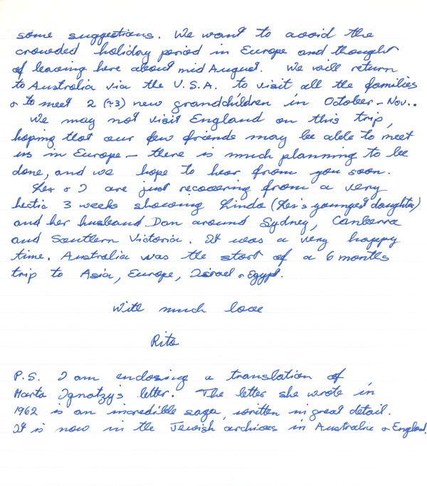 P.S. I am enclosing a translation of Marta Ignatzy’s letter. The letter she wrote in 1962 is an incredible saga, written in great detail. It is now in the Jewish archives in Australia and England.