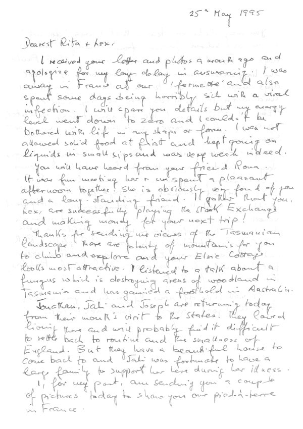 You will have heard from your friend Rona. It was fun meeting her and we spent a pleasant afternoon together. She is obviously very fond of you and a long standing friend. I gather that you, Lex, are successfully playing the Stock Exchange and making money for your next trip!