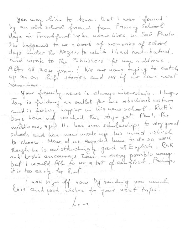 You may like to know that I was ‘found’ by an old school friend from Primary School days in Frankfurt who now lives in Sao Paulo. She happened to see a book of memories of school days under the Nazis, to which I had contributed, and wrote to the Publishers for my address. After all these years! We are now trying to catch up on our life stories and see if we can meet somewhere.