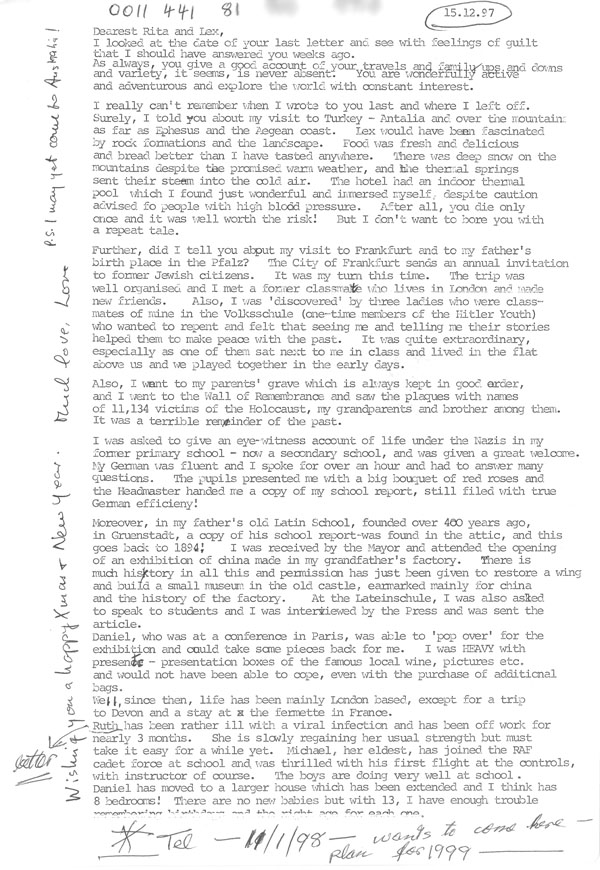 Further, did I tell you about my visit to Frankfurt and to my father’s birth place in the Pfalz? The City of Frankfurt sends an annual invitation to former Jewish citizens. It was my turn this time. The trip was well organised and I met a former classmate who lives in London and made new friends. Also, I was ‘discovered’ by three ladies who were classmates of mine in the Volksschule (one-time members of the Hitler Youth) who wanted to repent and felt that seeing me and telling me their stories helped them to make peace with the past. It was quite extraordinary, especially as one of them sat next to me in class and lived in the flat above us and we played together in the early days.