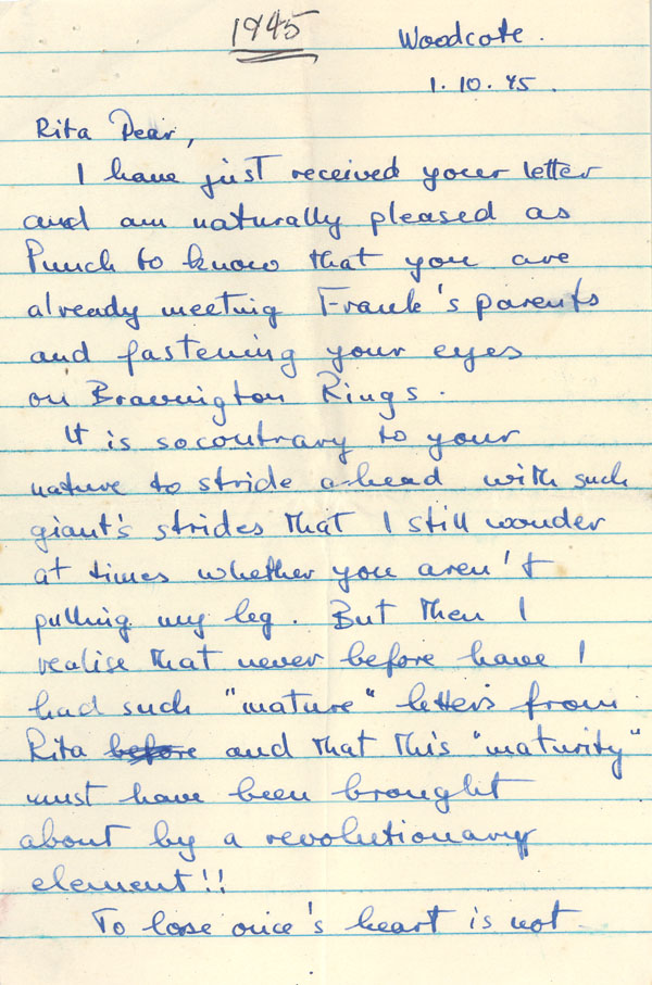 I have just received your letter and am naturally pleased as Punch to know that you are already meeting Frank’s parents and fastening your eyes on Bravington Rings.