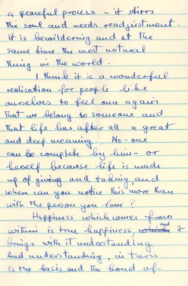 I think it is a wonderful realisation for people like ourselves to feel once again that we belong to someone and that life has after all a great and deep meaning. No-one can be complete by him – or herself because life is made up of giving and taking, and where can you notice this more than with the person you love?