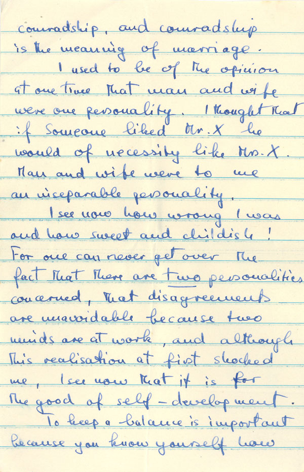I see now how wrong I was and how sweet and childish! For one can never get over the fact that there are two personalities concerned, that disagreements are unavoidable because two minds are at work, and although this realisation at first shocked me, I see now that it is for the good of self-development.