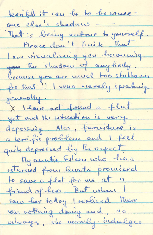 My auntie Eileen who has returned from Canada promised to save a flat for me at a friend of hers. But when I saw her today I realised there was nothing doing and, as always, she merely indulges in grand sounding phrases without lifting a finger. I must say I was bitterly disappointed and I hate her for her self-centredness and double-tongue.