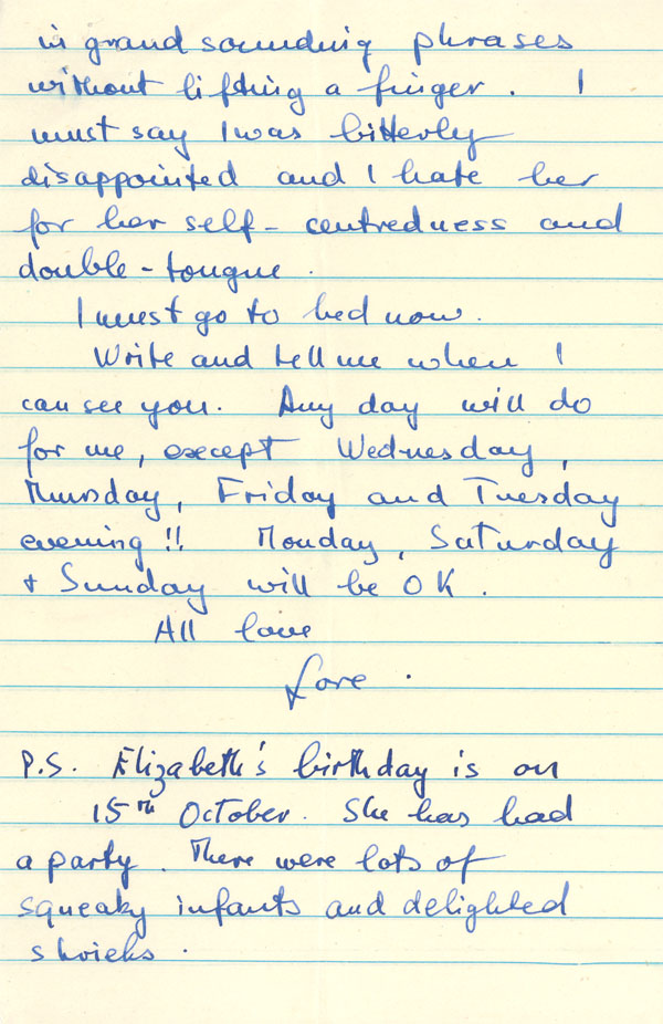 I must go to bed now. Write and tell me when I can see you. Any day will do for me, except Wednesday, Thursday, Friday and Tuesday evening!! Monday, Saturday and Sunday will be OK.