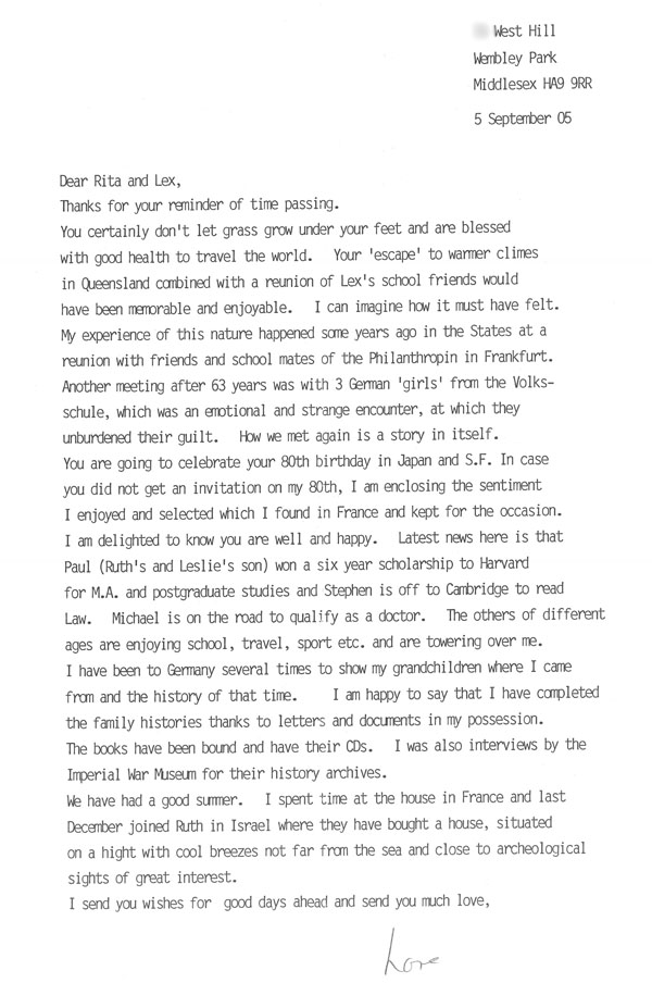 You certainly don’t let grass grow under your feet and are blessed with good health to travel the world. Your ‘escape’ to warmer climes in Queensland combined with a reunion of Lex’s school friends would have been memorable and enjoyable. I can imagine how it must have felt. My experience of this nature happened some years ago in the States at a reunion with friends and school mates of the Philanthropin in Frankfurt. Another meeting after 63 years was with 3 German ‘girls’ from the Volksschule, which was an emotional and strange encounter, at which they unburdened their guilt. How we met again is a story in itself.