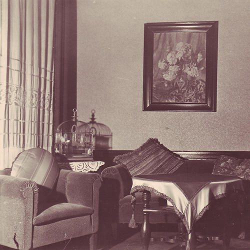 Memories of what home looked like are important. I found this out when looking at two photos of our living room in Frankfurt – yes, there was the round table with the green satin and gold tassels, and there in the corner stood the bird cage with Haenschen, my little canary, and against the wall my mother’s beautiful and cherished glass-fronted book case.