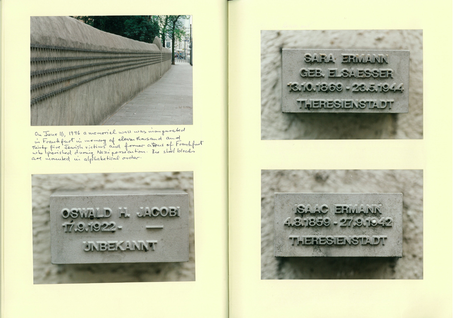 The plaques for Lore's brother, Oswald, and Sally and Clara on a memorial wall, inaugurated in Frankfurt in 1996,
