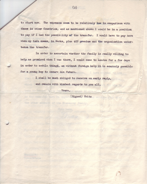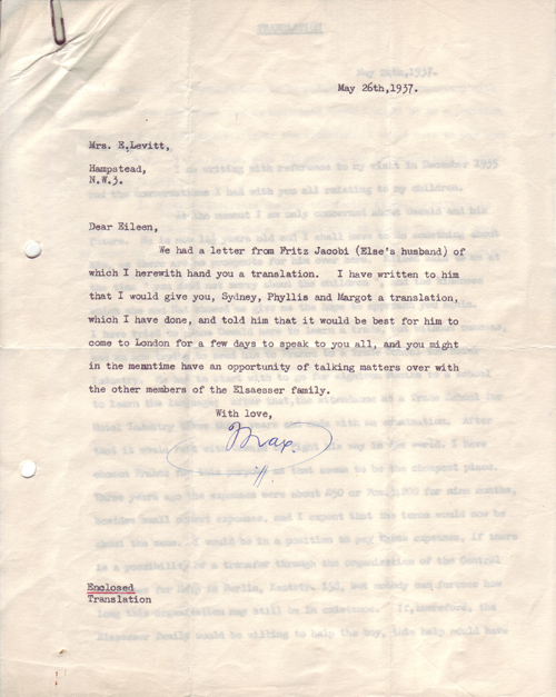 We had a letter from Fritz Jacobi (Else’s husband) of which I herewith hand you a translation. I have written to him that I would give you, Sydney, Phyllis and Margot a translation which I have done, and told him that it would be best for him to come to London for a few days to speak to you all, and you might in the meantime have the opportunity of talking matters over with the other members of the Elsaesser family.