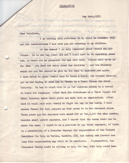 I have tried to place Oswald here to learn a trade, but without success, and am now trying to send him to France to a Trade School for Hotel Industry. He has to start with to go for eighteen months to a school to learn the language; after that, the attendance at a Trade School for Hotel Industry takes three years and ends with an examination. After that it would rest with Oswald to fight his way in the world. I have chosen France for this purpose as that seems to be the cheapest place. Three years ago the expenses were about £50 or Fcs. 3,200 for nine months, beside small pocket expenses and I expect that the terms would now be about the same. I would be in a position to pay these expenses, if there is a possibility of a transfer through the organisation of the Central Committee for Help in Berlin, Kantstr. 158, but nobody can foresee how long this organisation may still be in existence. If, therefore, the Elsaesser family would be willing to help the boy, this help would have to start now. The expenses seem to be relatively low in comparison with those in other Countries, and as I mentioned above I would be in a position to pay if I had the possibility of the transfer. I would have to pay here when my turn comes, in Marks, plus 40% premium and the organisation undertakes the transfer.