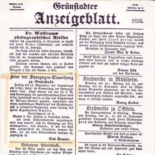 Old records show that Gruenstadt had a synagogue since 1856. An announcement in the Gruenstaedter Anzeigeblatt of the same year reads as follows: