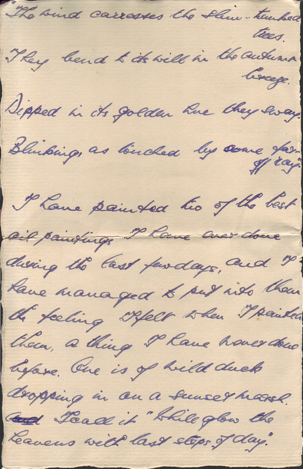 I have painted two of the best oil paintings I have ever done during the last few days, and I have managed to put into them the feeling I felt when I painted them, a thing I have never done before. One is of wild ducks dropping in on a sunset marsh. I call it “Chill glow the heavens with last steps of day.”