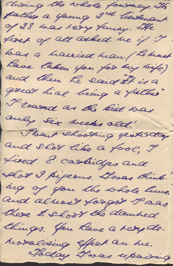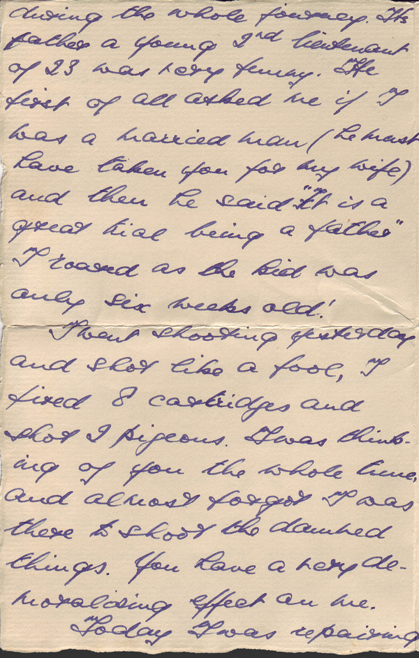 I went shooting yesterday and shot like a fool, I fired 8 cartridges and shot 2 pigeons. I was thinking of you the whole time, and almost forgot I was there to shoot the damned things. You have a very demoralising effect on me.