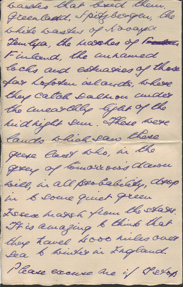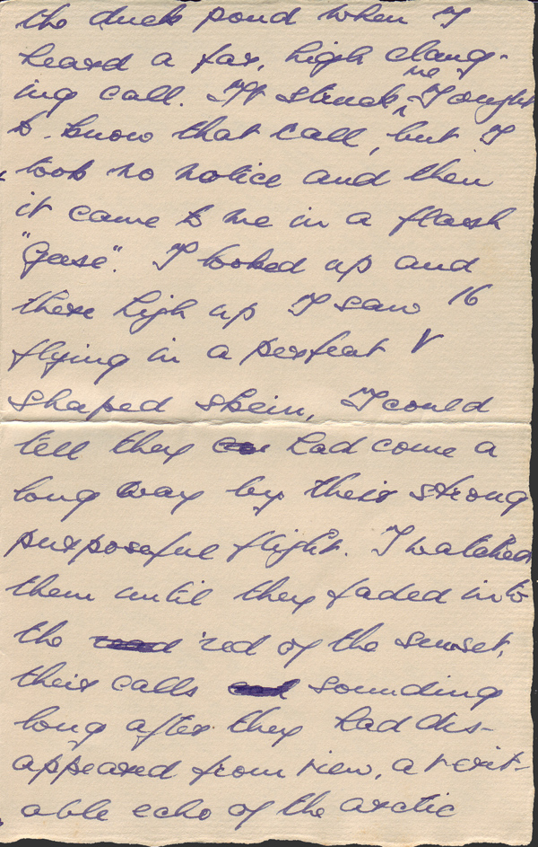 Today I was repairing the duck pond when I heard a far, high clanging call. It struck me I ought to know that call, but I took no notice and then it came to me in a flash “Geese”. I looked up and there high up I saw 16 flying in a perfect V shaped skein, I could tell they had come a long way by their strong, purposeful flight. I watched them until they faded into the red of the sunset, their calls sounding long after they had disappeared from view, a veritable echo of the Arctic wastes that bred them, Greenland, Spitzbergen, the white wastes of (unintelligible), the marshes of Finland, the unnamed locks and estuaries of those far Lafoten islands, where they catch salmon under the unearthly light of the midnight sun. Those were lands which saw those geese last who, in the grey of tomorrow’s dawn will, in all probability, drop in to some quiet green Essex marsh from the stars. It is amazing to think that they travel 4000 miles over sea to winter in England.
