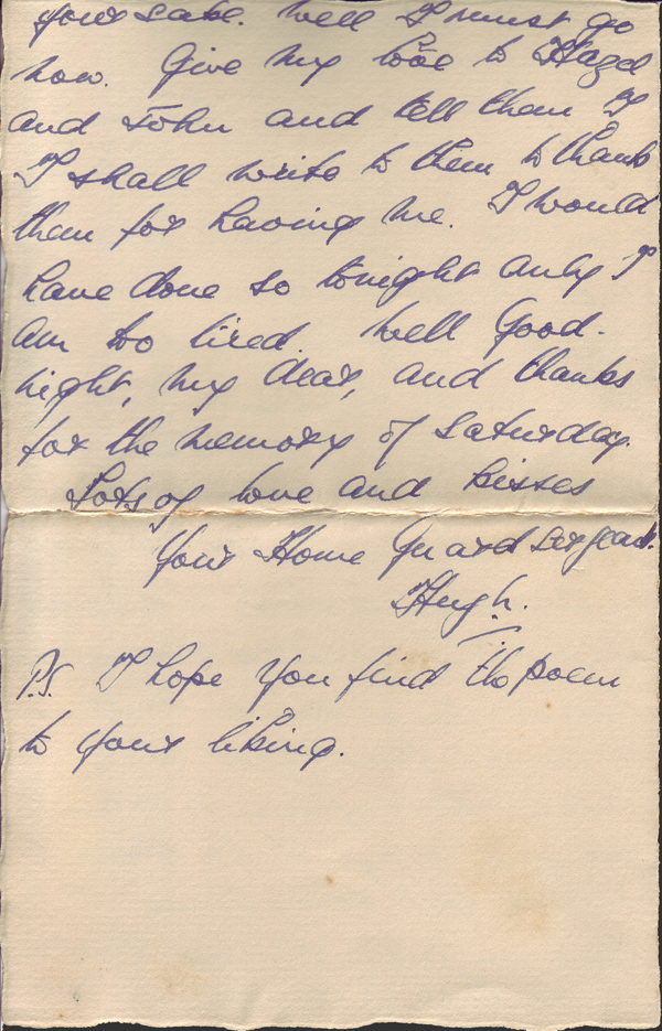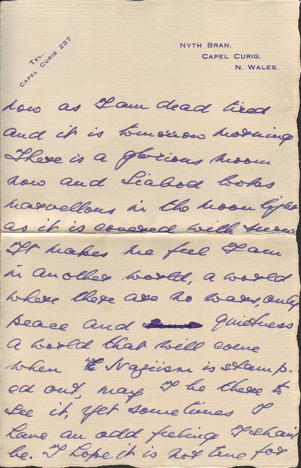 Please excuse me if I stop now as I am dead tired and it is tomorrow morning. There is a glorious moon now and Siabod looks marvellous in the moonlight as it is covered with snow. It makes me feel I am in another world, a world where there are no wars, only peace and quietness, a world that will come when Naziism is stamped out, may I be there to see it, yet sometimes I have an odd feeling I shan’t be. I hope it is not true for your sake. Well I must go now. Give my love to Hazel and John I shall write to them to thank them for having me. I would have done so tonight only I am too tired. Well Goodnight, my Dear, and thanks for the memory of Saturday.