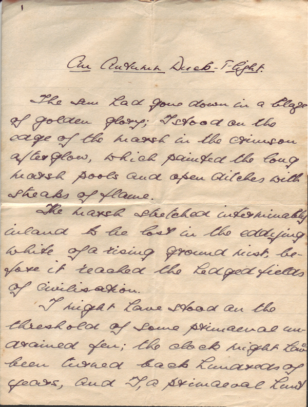 I might have stood on the threshold of some primaeval undrained fen; the clock might have been turned back hundreds of years, and I, a primaeval hunter dressed in bearskin with a wolfhound at my feet instead of a very imaginative flight shooter with a twelve bore in the crook of my arm and a spaniel at my heels.