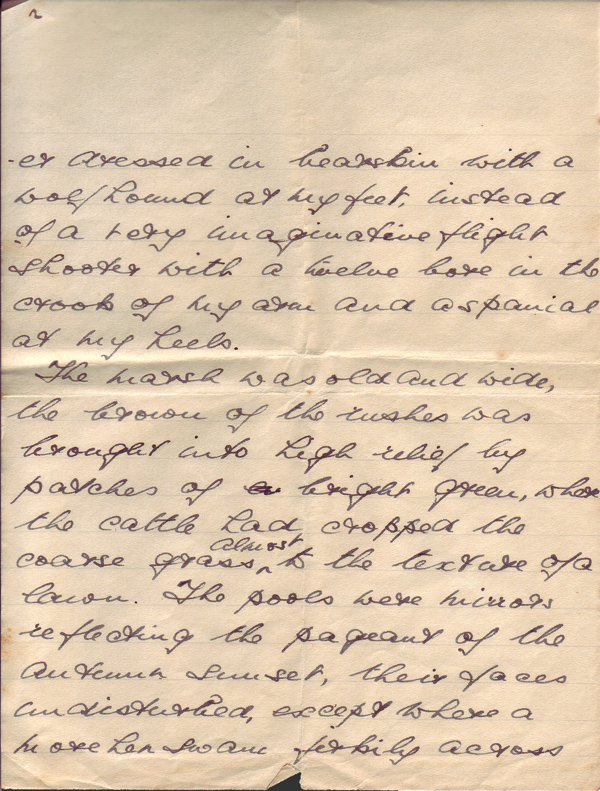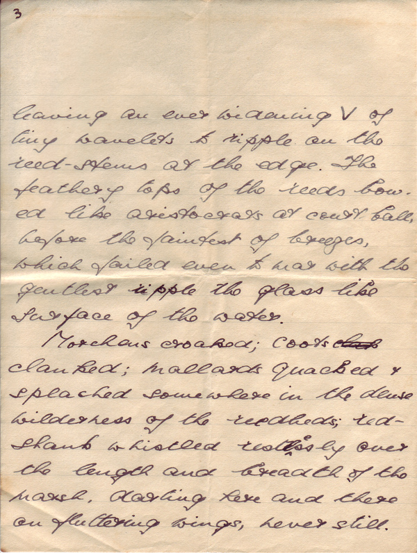 The marsh was old and wide, the brown of the rushes was brought into high relief by patches of bright green where the cattle had cropped the coarse grass almost to the texture of a lawn. The pools were mirrors reflecting the pageant of the autumn sunset, their faces undisturbed, except where a moorhen swam jerkily across leaving an ever widening V of tiny wavelets to ripple on the reed-stems at the edge. The feathery tops of the reeds bowed like aristocrats at court balls before the faintest of breezes, which failed to mar even with the gentlest ripple the glass like surface of the water.