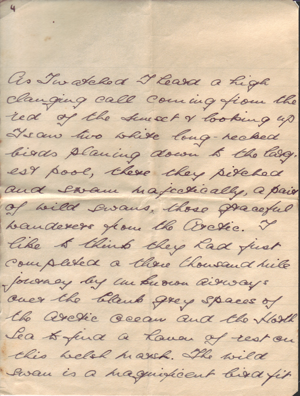 Moorhens croaked; coots clanked; mallards quacked and splashed somewhere in the dense wilderness of the reedbeds; redshanks whistled restlessly over the length and breadth of the marsh, darting here and there on fluttering wings, never still. As I watched I heard a high clanging call coming from the red of the sunset and looking up I saw two white long-necked birds planing down to the largest pool, there they pitched and swam majestically, a pair of wild swans, those graceful wanderers from the Arctic. I like to think they had just completed a three thousand mile journey by unknown airways over the blank grey spaces of the Arctic Ocean and the North Sea to find a haven of rest on this Welsh marsh. The wild swan is a magnificent bird fit to be admired, an adventurer as old as time.