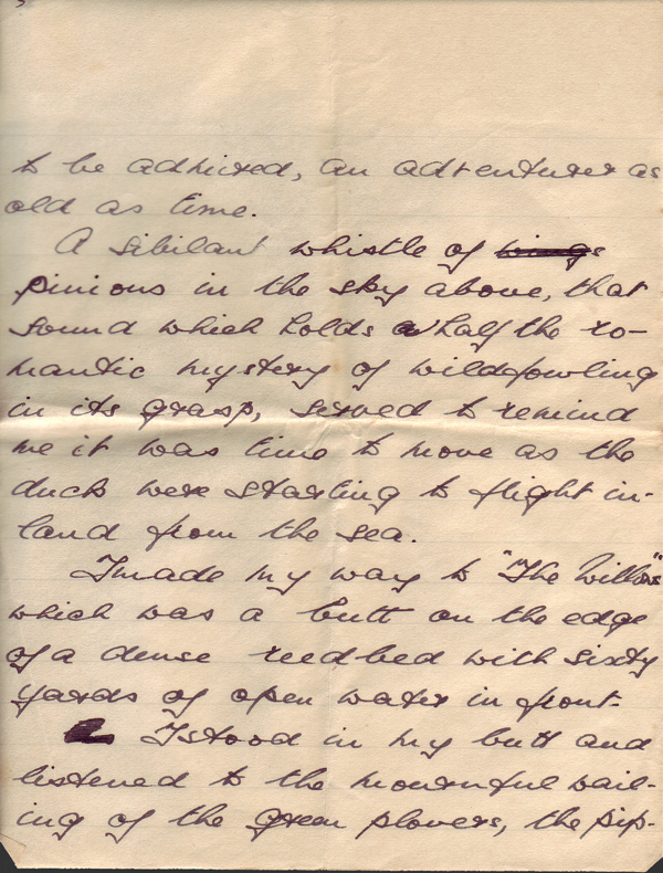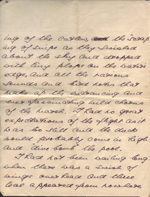 I stood in my butt and listened to the mournful wailing of the green plovers, the piping of the curlew, the scraping of snipe as they swished about the sky and dropped with tiny plops on the water’s edge, and all the various sounds and bird notes that make up the entrancing and ever fascinating wild chorus of the marsh. I had no great expectations of the flight as it was too still and the ducks would probably come in high and “dive bomb” the pool.