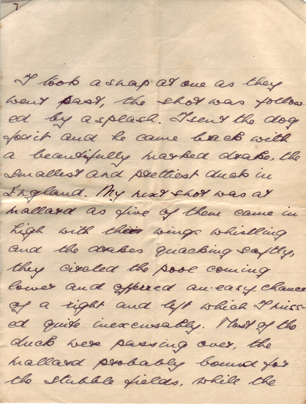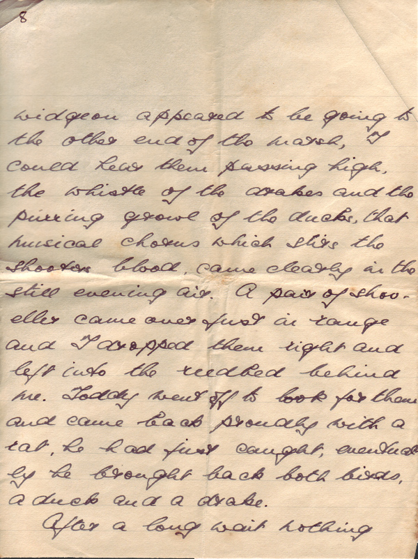I had not been waiting long when there was a swish of wings overhead and three teal appeared from nowhere. I took a snap at one as they went past, the shot was followed by a splash. I sent the dog for it and he came back with a beautifully marked drake, the smallest and prettiest duck in England. My next shot was at mallard as five of them came in high with their wings whistling and the drakes quacking softly, they circled the pool coming lower and offered an easy chance of a right and left which I missed quite inexcusably. Most of the ducks were passing over, the mallard probably bound for the stubble fields, while the widgeon appeared to be going to the other end of the marsh. I could hear them passing high, the whistle of the drakes and the piercing growl of the ducks, that musical chorus which stirs the shooter’s blood, came clearly in the still evening air. A pair of shoveller came over just in range and I dropped them right and left into the reedbed behind me. Toddy went off to look for them and came back proudly with a rat he had just caught, eventually he brought back both birds, a duck and a drake.