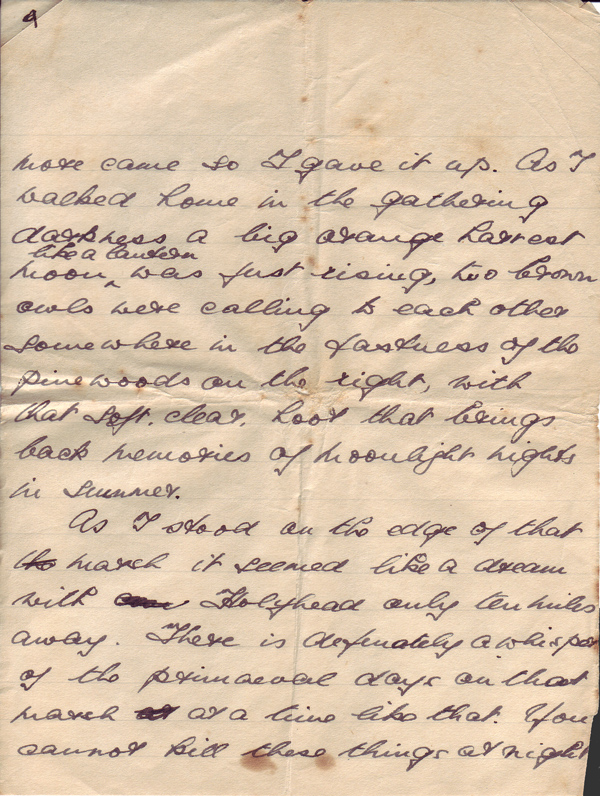 After a long wait nothing more came so I gave it up. As I walked home in the gathering darkness a big orange harvest moon like a lantern was just rising, two brown owls were calling to each other in the vastness of the pinewoods on the right, with that soft, clear hoot that brings back memories of moonlight nights in summer.