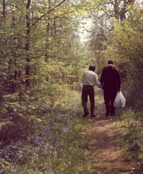 Moshe walking with his father, Nissim, in bluebell woods
