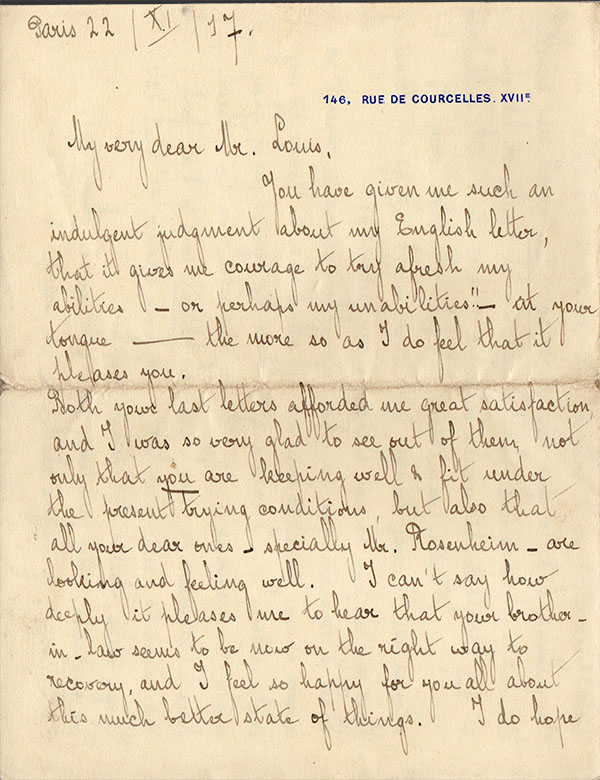 Both your last letters afforded me great satisfaction and I was so very glad to see out of them, not only that you are keeping well & fit under the present trying conditions, but also that all your dear ones – specially Mr. Rosenheim – are looking and feeling well. I can’t say how deeply it pleases me to hear that your brother-in-law seems to be now on the right way to recovery, and I feel so happy for you all about this much better state of things. I do hope that your next letter will confirm this improvement and bring me good news about all your dear ones, also about your father whom* I hope to be quite free again from the gout.