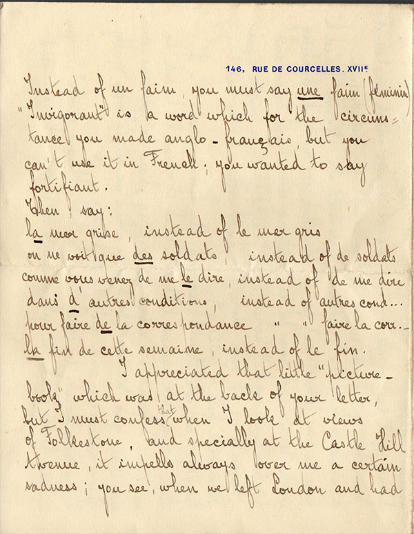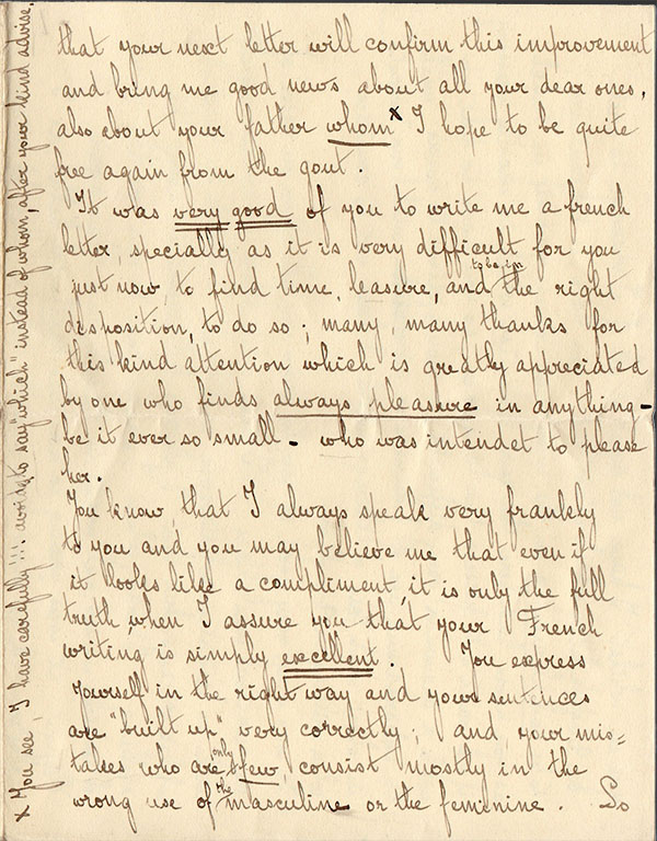 You know that I always speak very frankly to you and you may believe me that even if it looks like a compliment, it is only the full truth, when I assure you that your French writing is simply excellent. You express yourself in the right way and your sentences are “built up” very correctly; and your mistakes who are only few, consist mostly in the wrong use of the masculine or the feminine. So you see, whilst I have no merit at all if I manage to write an English letter which is ‘not bad’, you have, on the contrary, to be complimented on the way you express yourself in French, as you never had here the real practise which is mostly necessary if one want’s to possess the language, as you have to put up with a grammar very difficult in comparison to yours, with the embarrassing use of feminine or masculine, with our “accents” – in short with lots of things which I have not to consider when writing in English.