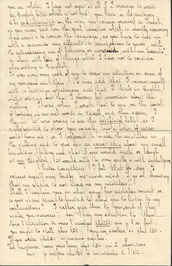 It was very, very good of you to draw my attention on some of my numerous mistakes; I may add that I express myself with no hesitation whatsoever and that I think in English, whilst writing, but that I always feel uncertain about the spelling. I was, when I wrote last to you, on the point of looking up several words in Cassell, and then again, I thought it was wrong to use this artificial help, as I really wanted to show you exactly how a letter of mine would turn up; so I preferred to make the mistakes in the spelling and to give you an exact idea about my small knowledge, feeling sure that if you would smile of laugh at my English, it would only be very gently with indulgence.