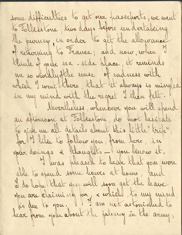 I was pleased to hear that you were able to spend some hours at home, and I do hope that you will soon get the leave you are claiming for, & which, to my mind, is due to you. I am not astonished to hear from you about the jalousy in the army; this terrible war has made people so hateful, so hard toward one another, that even here, in civilian life, I often see the results of terrible jalousy. You do not know how hard some mothers are toward boys who are in less danger than their own sons!!