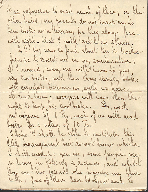 So I try now to find about ten to twelve friends to assist me in my combination; if I succeed, everyone will have to pay, say two books, and then those twenty books will circulate between us, until we have all read them; everyone will have then the right to keep his two books. So, with an expense of 8 Frs., each of us will read books for a value of 80 Frs.