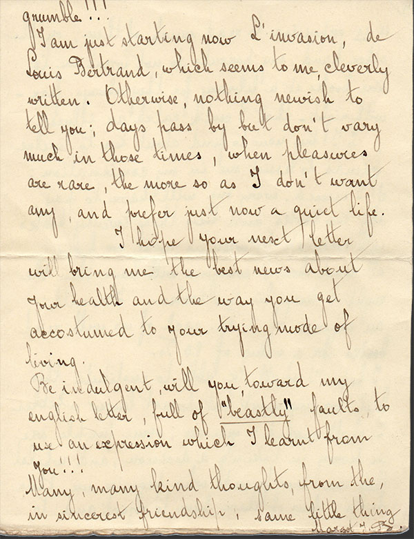 I am just starting now L’invasion, de Louis Bertrand, which seems to me, cleverly written. Otherwise, nothing newish to tell you; days pass by but don’t vary much in those times, when pleasures are rare, the more so as I don’t want any, and prefer just now a quiet life.