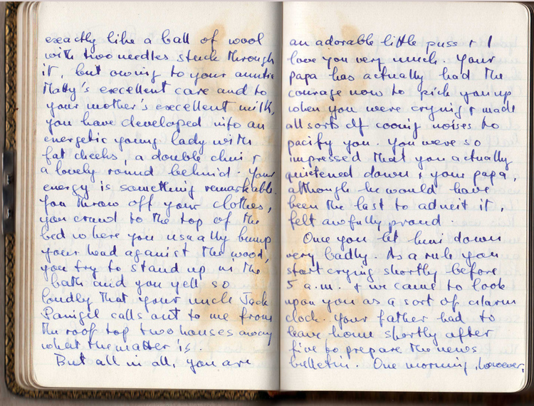 When you came home from hospital your proud mother said you looked exactly like a ball of wool with two needles stuck through it. But owing to your auntie Matty’s excellent care and to your mother’s excellent milk, you have developed into an energetic young lady with fat cheeks, a double chin and a lovely round behind. Your energy is something remarkable, you throw off your clothes, you crawl to the top of the bed where you usually bump your head against the wood, you try to stand up in the bath and you yell so loudly that your uncle Jack? calls out to me from the roof top two houses away to see what the matter is.