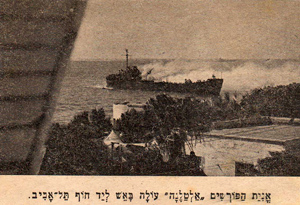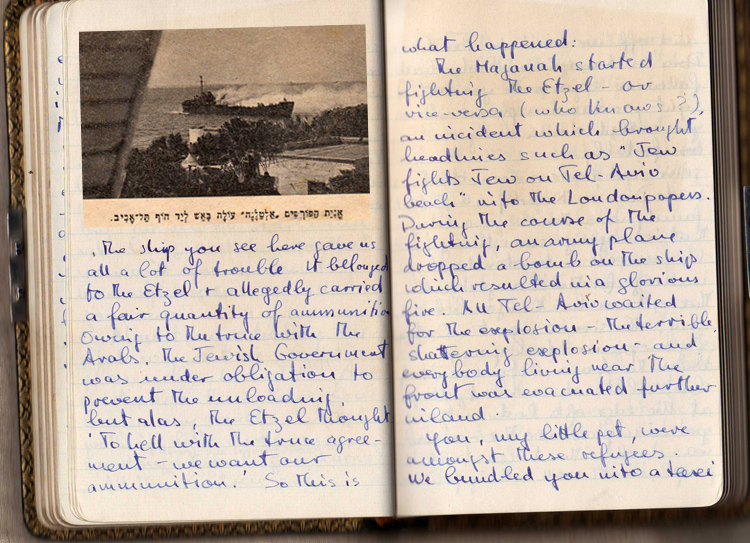 The ship you see here gave us a lot of trouble it belongs to the Etzel and allegedly carried a fair quantity of ammunition. Owing to the truce with the Arabs, the Jewish Government was under obligation to prevent the unloading but alas, the Etzel thought ‘to hell with the truce agreement – we want our ammunition’ so this is what happened. The Haganah started fighting the Etzel – or vice-versa, (who knows?) an incident which brought headlines such as “Jew fights Jew on Tel Aviv Beach” into the London Papers. During the fighting an Army plane dropped a bomb onto the ship which resulted in a glorious fire. All Tel Aviv waited for the explosion – the terrible shattering explosion- and everyone living the front was evacuated further inland.