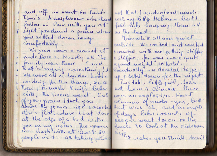 We sure were a crowd at Tante Dora’s. Nearly all the family were there (and that is saying something) We were all on tender hooks waiting for the bang, and then, to make things better still, the sirens went. Out of your pram I took you, down the stairs into somebody else’s flat, where I sat down at the edge of the bed with you in my arms. The room was dark with at least 20 people in it- all talking politics, not that I understood much with my little Hebrew- but I felt like banging them all on the head.