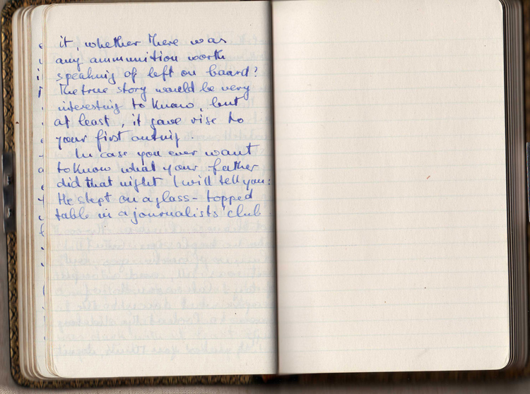 In case you want to know what your father did that night I will tell you: he slept on a glass topped table in a journalists club.